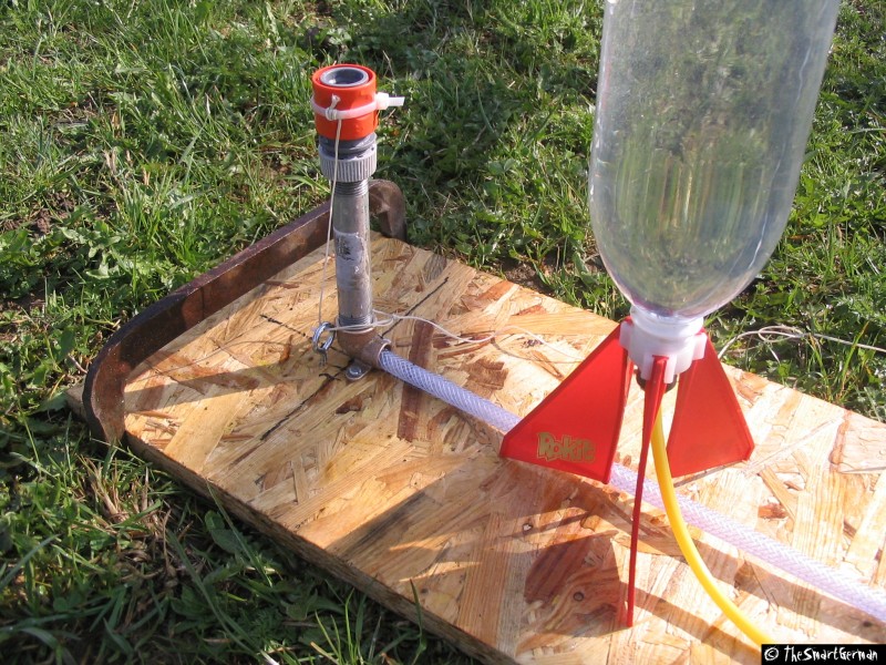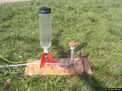 Mit Hilfe einer handelsüblichen Luftpumpe wird in der Wasserflasche ein Überdruck aufgebaut. Ist dieser entsprechend hoch, wird der Stopfen aus der Düse gedrückt und die komprimierte Luft stößt das Wasser mit hoher Geschwindigkeit aus der Düse. Durch den Rückstoß wird die Rakete beschleunigt und fliegt. Da die Rakete keinen Fallschirm besitzt, fällt diese einfach wieder zu Boden und kann neu betankt werden.