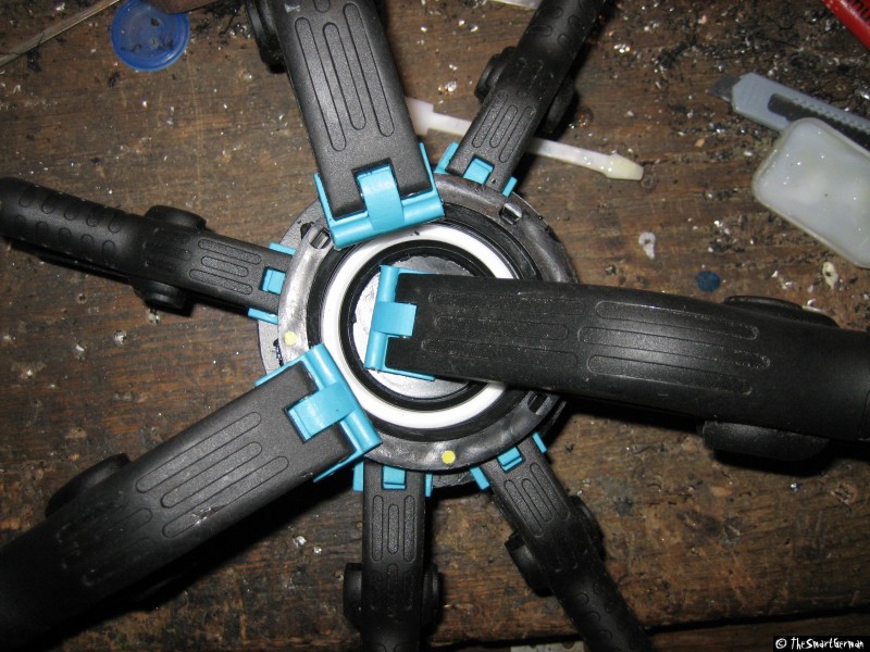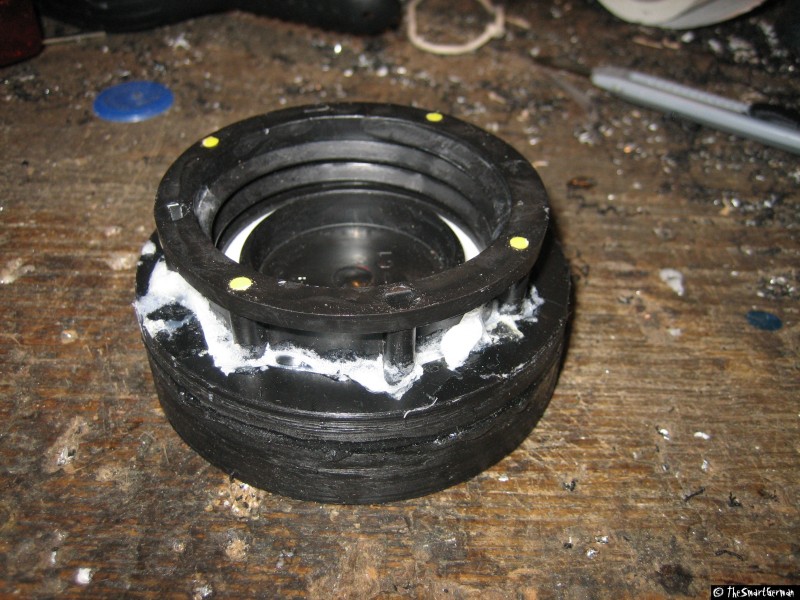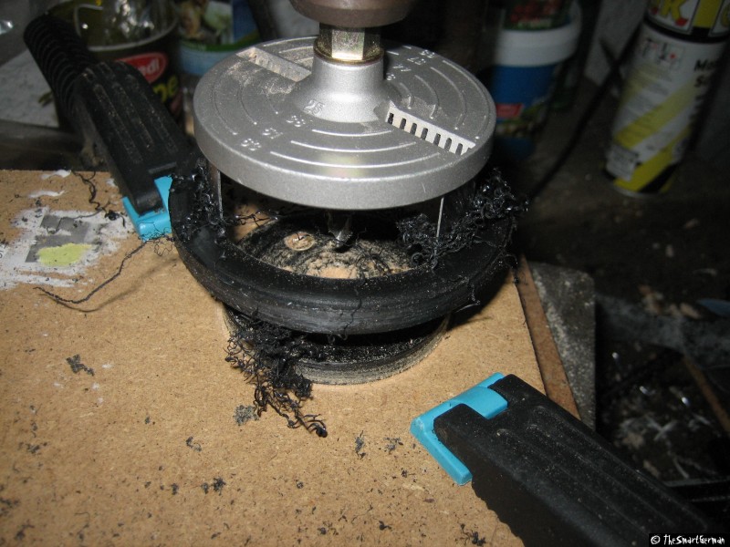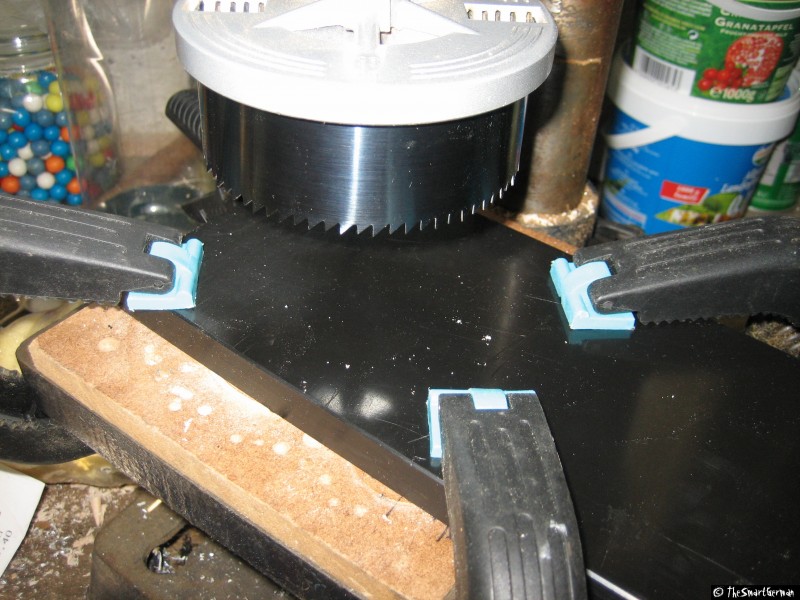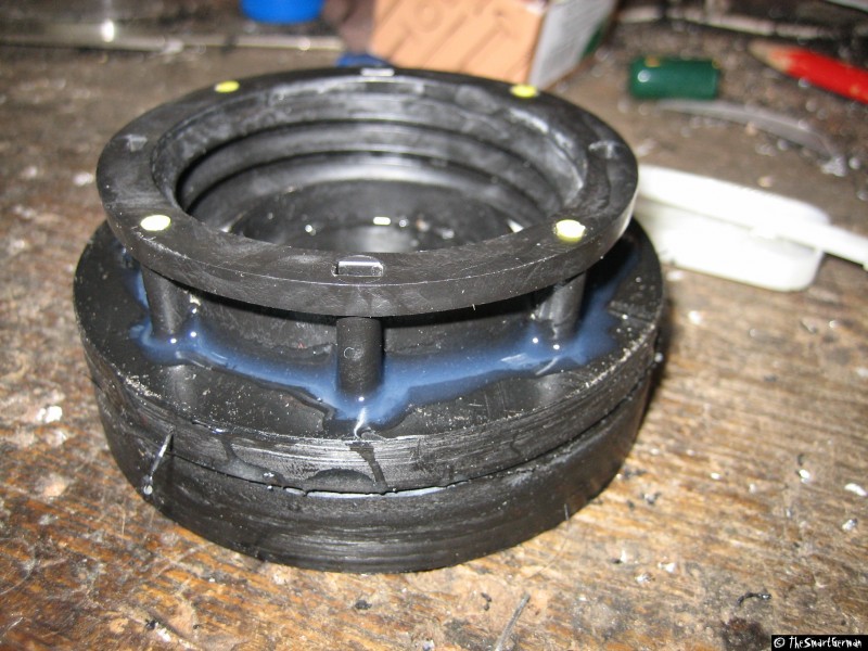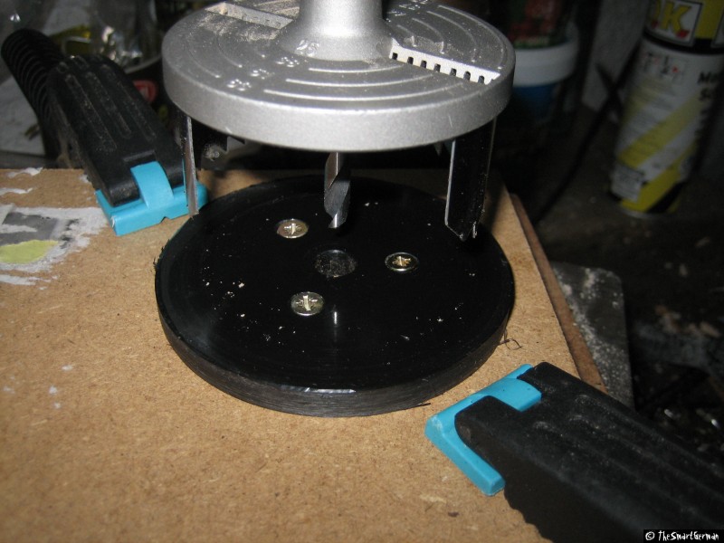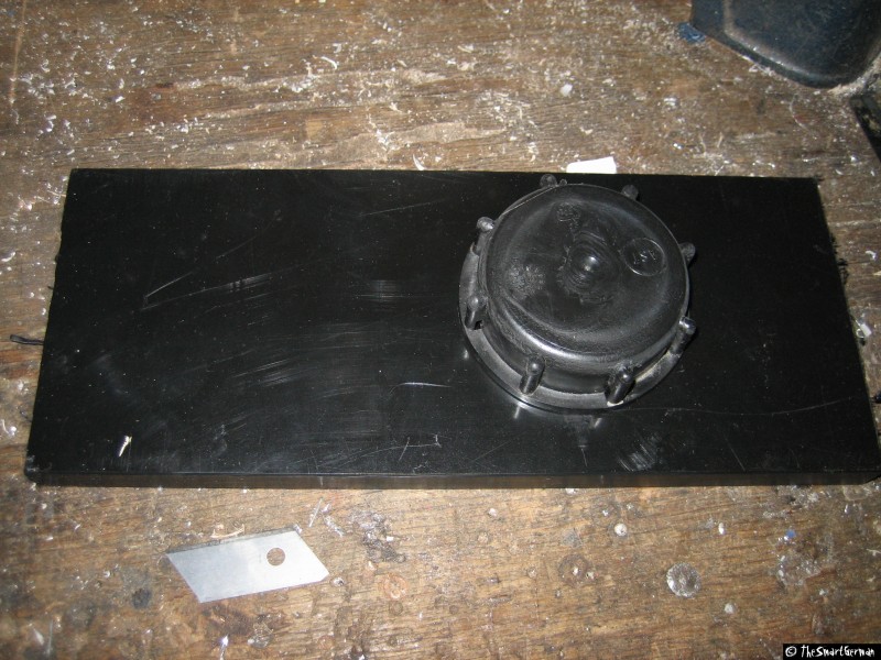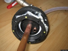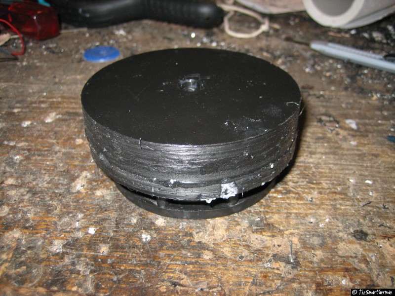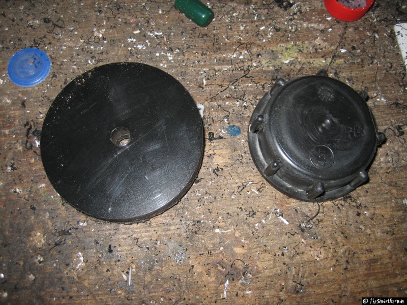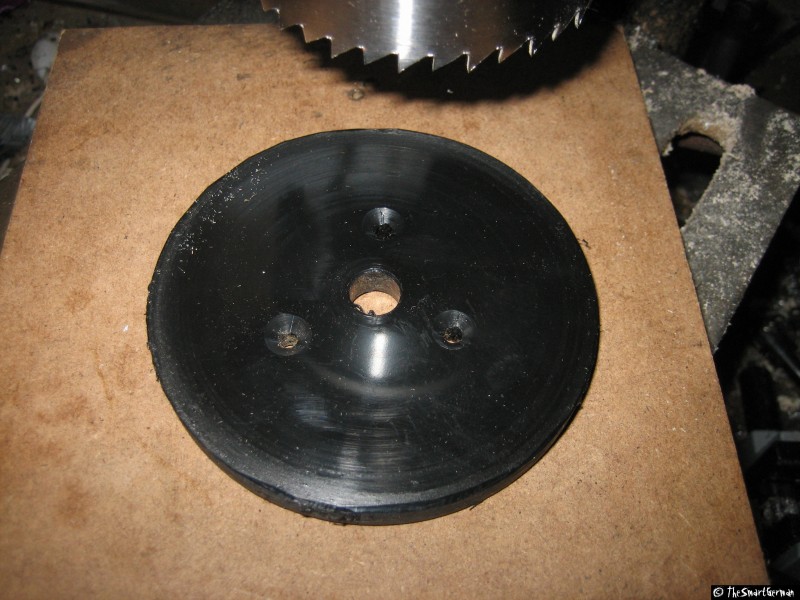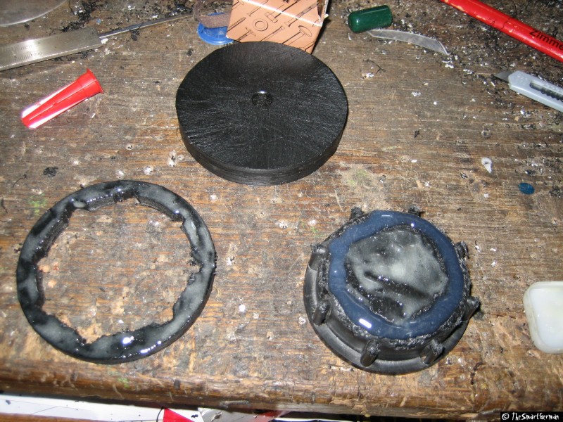 Um den Absperrhahn und die Luftzufuhr sicher befestigen zu können, wird der Deckel mit Hilfe einer Kunststoffplatte verstärkt. Hierfür werden ein Ring und eine Scheibe aus der Kunststoffplatte geschnitten und mit dem Deckel verklebt. Hierfür werden zunächst zwei Scheiben gesägt. In eine der Scheiben werden weitere Löcher gebohrt, um sie damit auf ein Holzbrett schrauben zu können. Damit kann mit einer kleineren Lochsäge eine weitere Scheibe gesägt werden. Am Ende verbleibt ein Ring der über den Deckel passt.