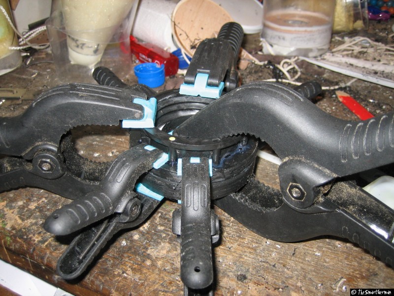 Nachdem alles entgratet und angeraut wurde, wird das ganze mit UHU Endfest 300 verklebt. Damit keine Luftlöcher entstehen, wird das ganze mit Leimklemmen verpresst.