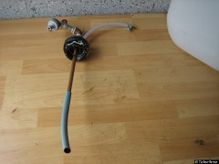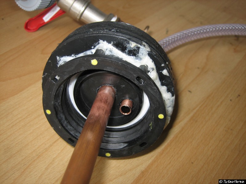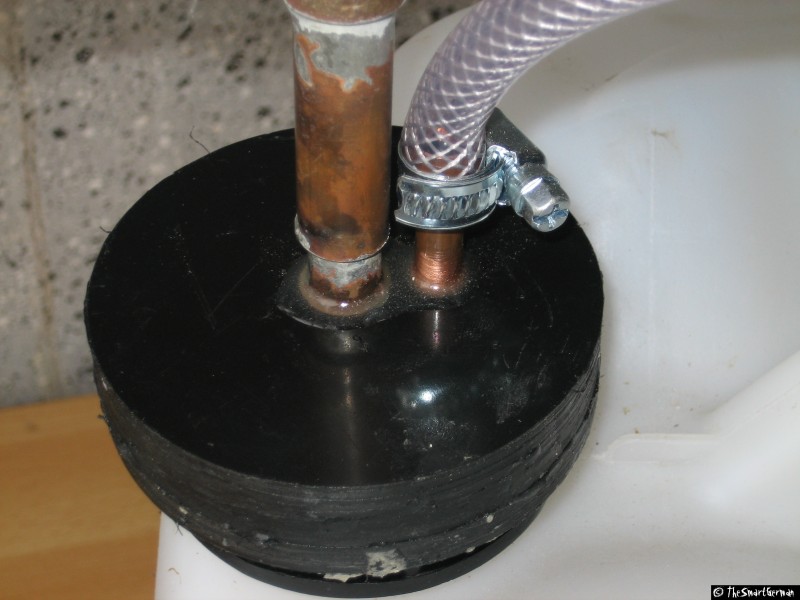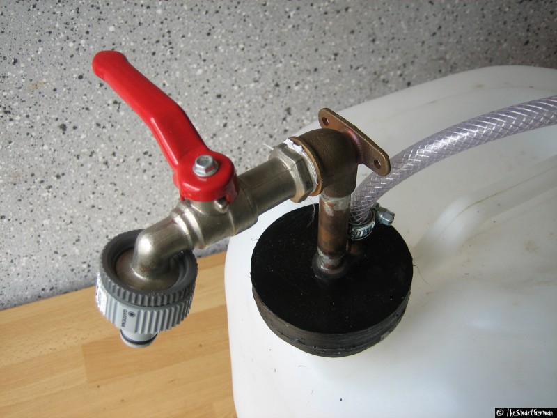 Nach dem Aushärten des Klebers werden zwei Löcher in den Deckel gebohrt. In diese wird zum einen das Steigrohr mit dem Absperrhahn geklebt, in das andere Loch kommt die Luftzuführung. An die Luftzurührung wird der Kompressorschlauch mit dem Fahrradventil angebracht. Das ganze wird mit Schlauchschellen gesichert. Am Ende des Steigrohrs ist ein Stück Schlauch, um den Tank bis auf den Boden entleeren zu können. Für den schnellen Zusammenbau ist eine Gardena Kupplung am Wasserhahn angebracht.