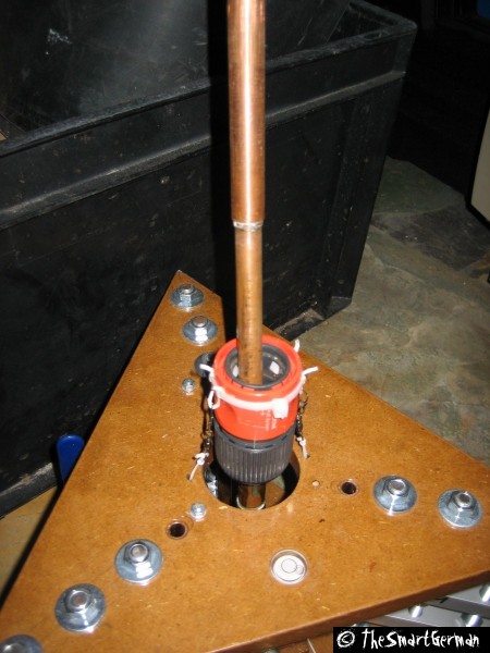 In den meisten Fällen reicht es die LT in die Kupplung zu stecken. Gelegentlich bleibt diese jedoch beim Start kurz hängen und wird dann von der Rakete ausgestoßen und diese wird zurück auf die Rampe geschossen und erzeugt unschöne Schlagspuren. Nach einigen Starts wurde deswegen noch eine Befestigung für die LT eingebaut. Hierfür wurde in das Standrohr der Rampe eine Querbohrung mit 4mm gesetzt, in welches ein 4mm Messingstab eingelötet wurde. In das Ende der LT wurde ein Schlitz geschnitten. Wer möchte kann diesen auch noch mit einem Querschnitt verstetzen und hat somit einen sicheren Bajonettverschluss. In meinem Fall Rastet die LT jedoch in das Standrohr ein und bleibt am Start an Ort und Stelle.