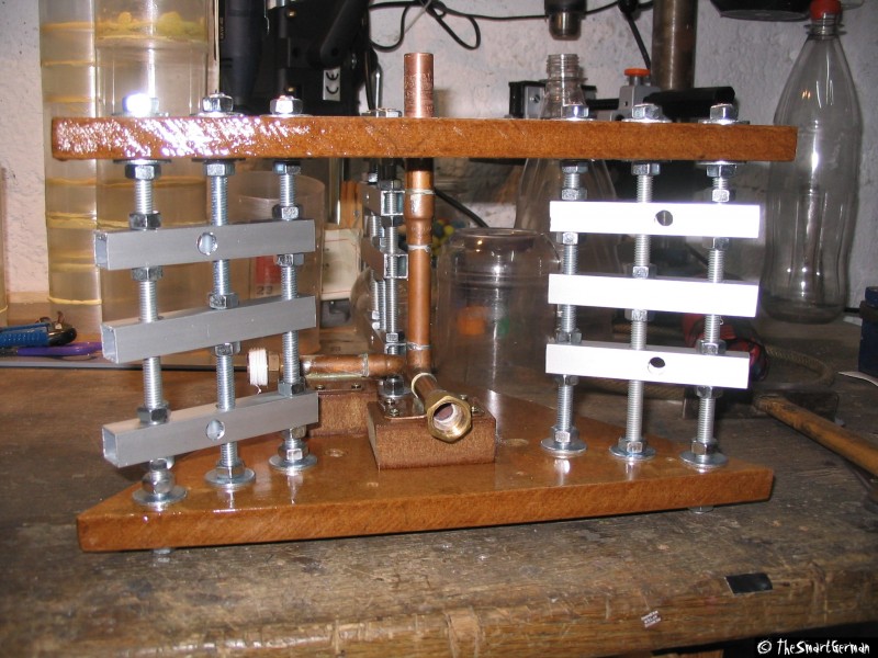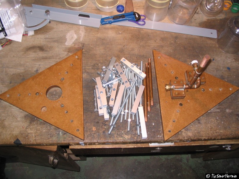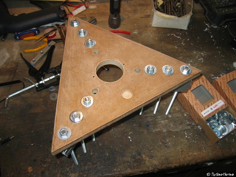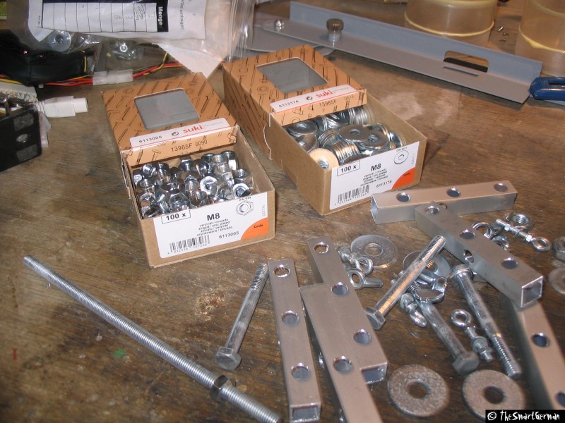 Die Abstandhalter aus Holz zwischen Boden- und Deckplatte, deren Anbringung sich als zu schwach erwiesen hatten, wurden entfernt und jeweils durch 3x M8 Gewindestangen ersetzt. Auf die Gewindestangen kamen 4-Kant-Alurohre mit Querbohrungen, um daran die Füße befestigen zu können.