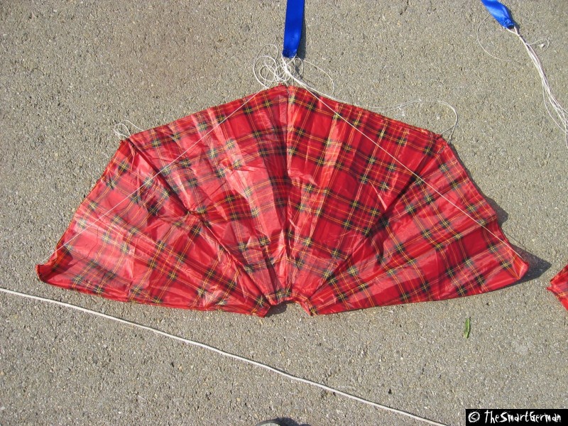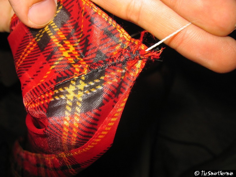 Aus der Bespannung schneiden wir an der Spitze ein Loch, die Kanten werden umgeschlagen und vernäht. Dieses Loch dient der Stabilisierung des Fallschirms. Jeweils auf die Ecken wird ein ca. 4cm langes Stück der dünnen Drachenschnur genäht. Damit diese beim entfalten des Fallschirms nicht herausgerissen wird, wird diese Umgeschlagen und nochmals vernäht.