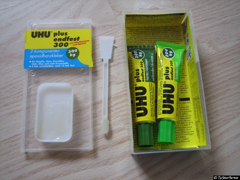 Hierbei handelt es sich um einen 2-Komponenten-Kleber. Es müssen vor der Anwendung Kleber und Härter zu gleichen Teilen in einem Schälchen gemischt werde. Mit diesem Kleber werden die Flaschendeckel in die Gardena Düsen geklebt. Auch für Klebeverbindungen Kupferrohr/Kunststoff hat sich UHU 300 Endfest hervorragend bewährt.
