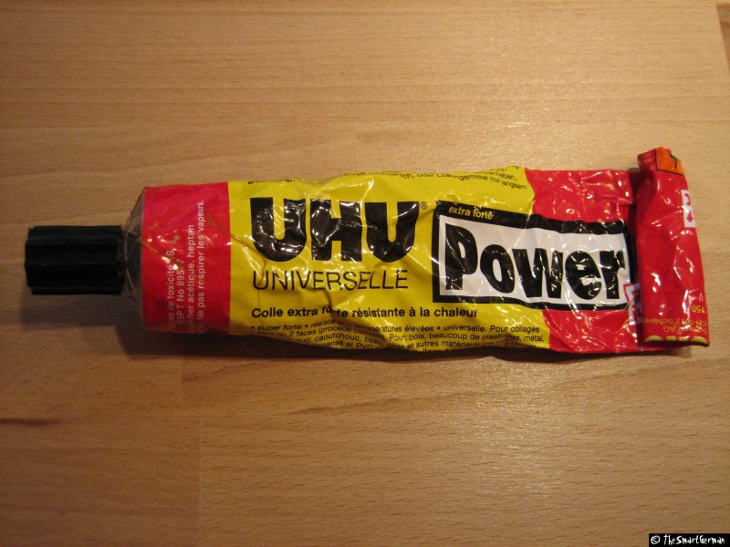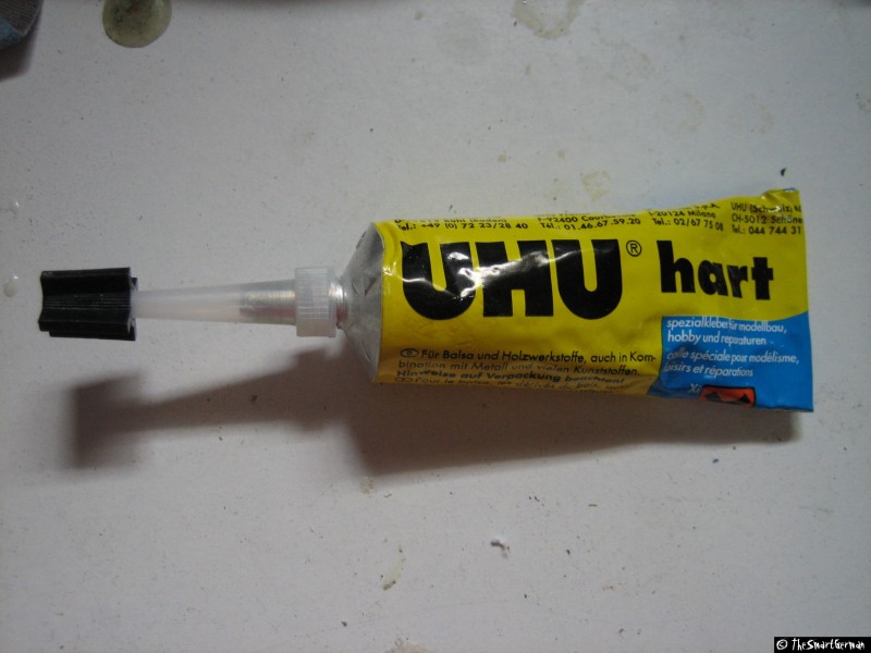 UHU Power - Diesen Kleber verwende ich hauptsächlich zum Kontaktkleben. Hierzu werden jeweils die zu verklebenden Teile mit Kleber bestrichen und der Kleber darf antrocknen. Dannach werde die beiden Teile miteinander verpresst. Mit dieser Technik fixiere ich mein Leitflossen an der gewünschten Position bevor ich sie entgültig mit Patex Spiegelkleber flugtauglich mache.