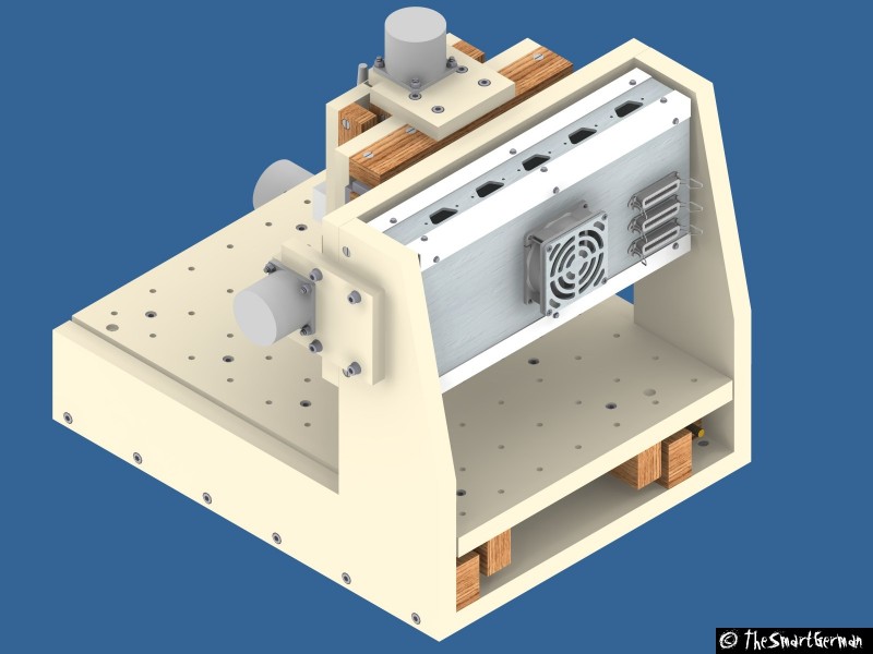 Die Grundkonstruktion der CNC-Maschine besteht aus einer Grundplatte und zwei Seitenwänden. Auf der Grundplatte wird der Tisch befestigt welcher in der Y-Achse verfährt.