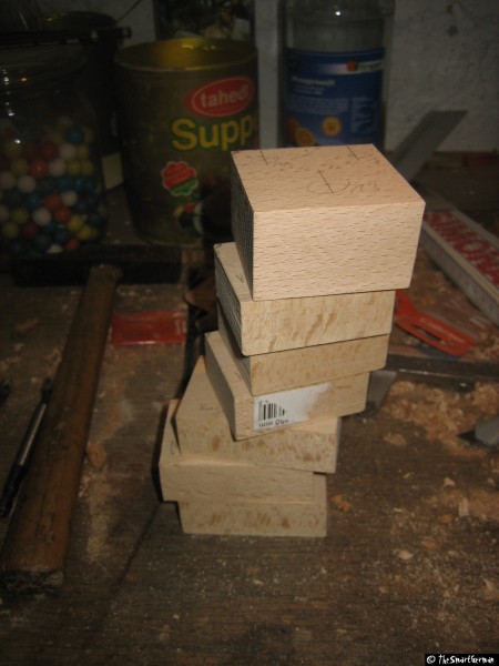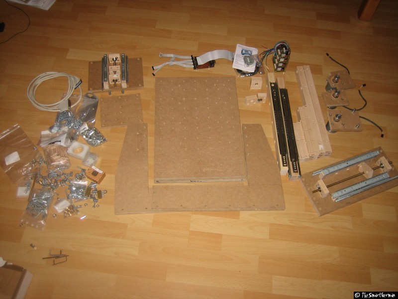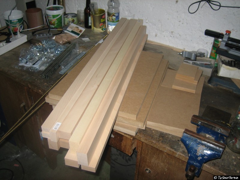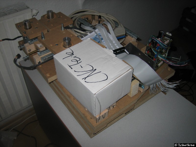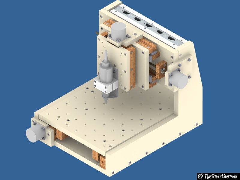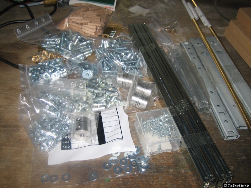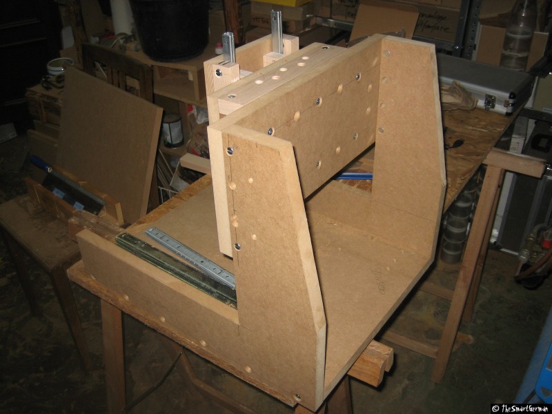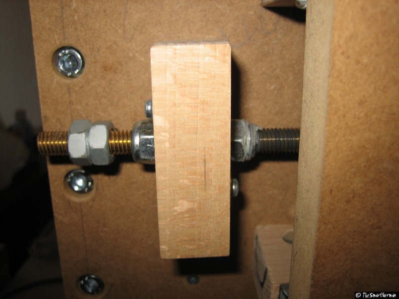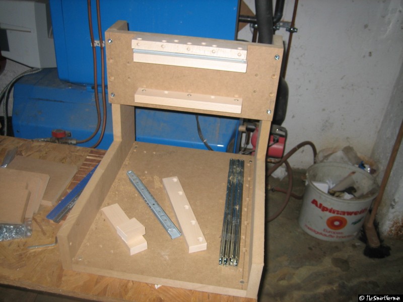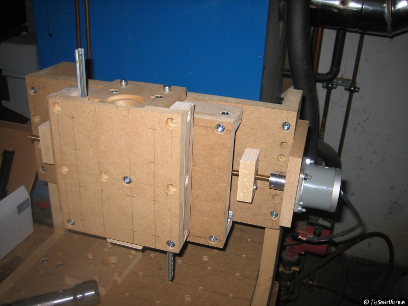 Die CNC-Fräse ist im Großen und Ganzen aus Holz aufgebaut: MDF-Platten und Buchen Kanthölzer. Als Spindeln dienen M8 Gewindestangen. Dies sind nicht die typischen Materialien um eine präzise CNC-Fräse zu bauen. Doch hier geht es um eine "Arbeit-Erleichterungs-Maschine" und nicht um Arbeiten im 1/100mm Bereich.