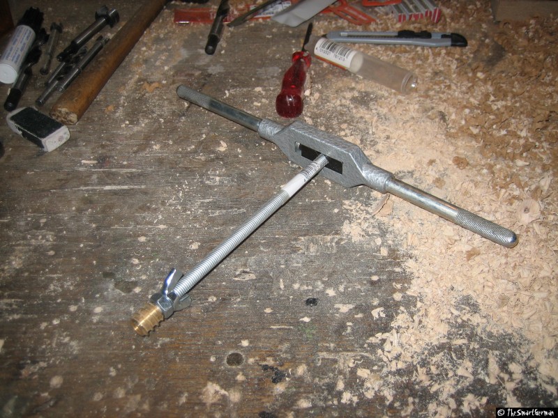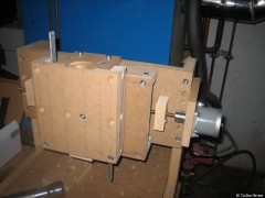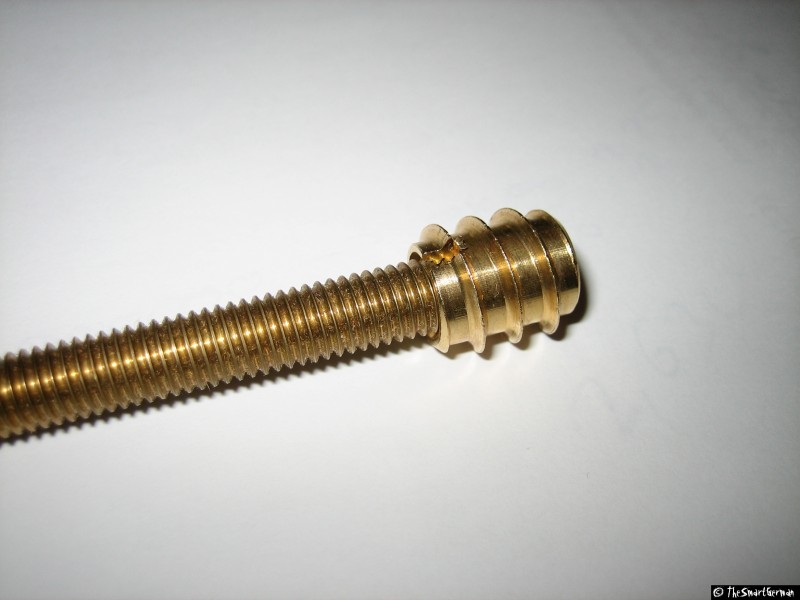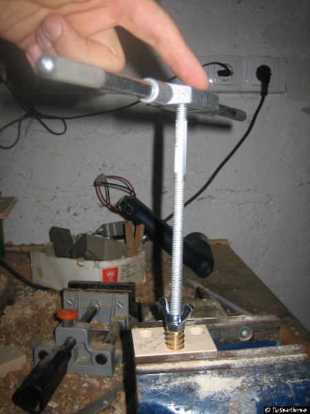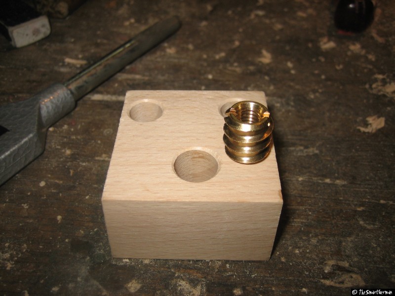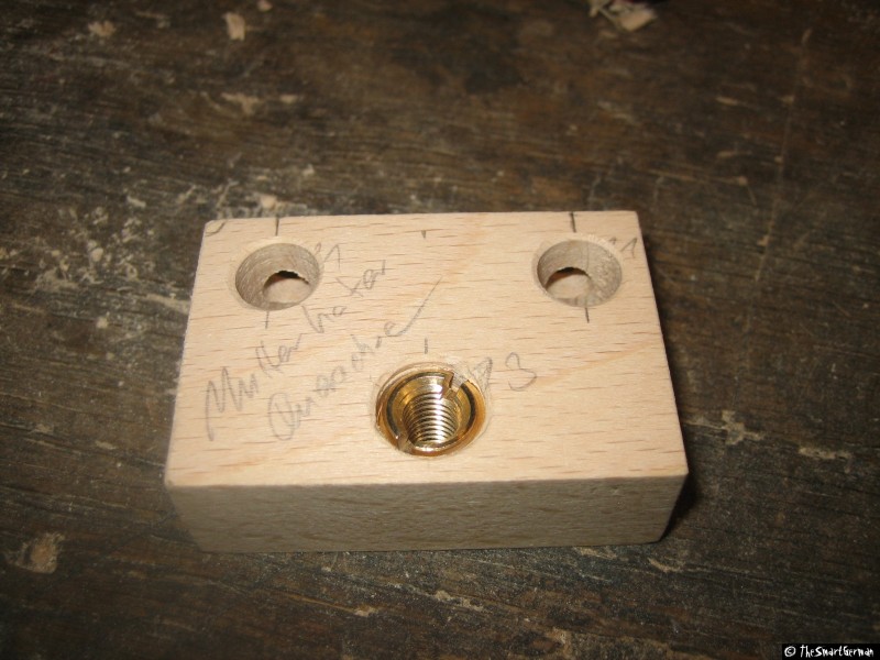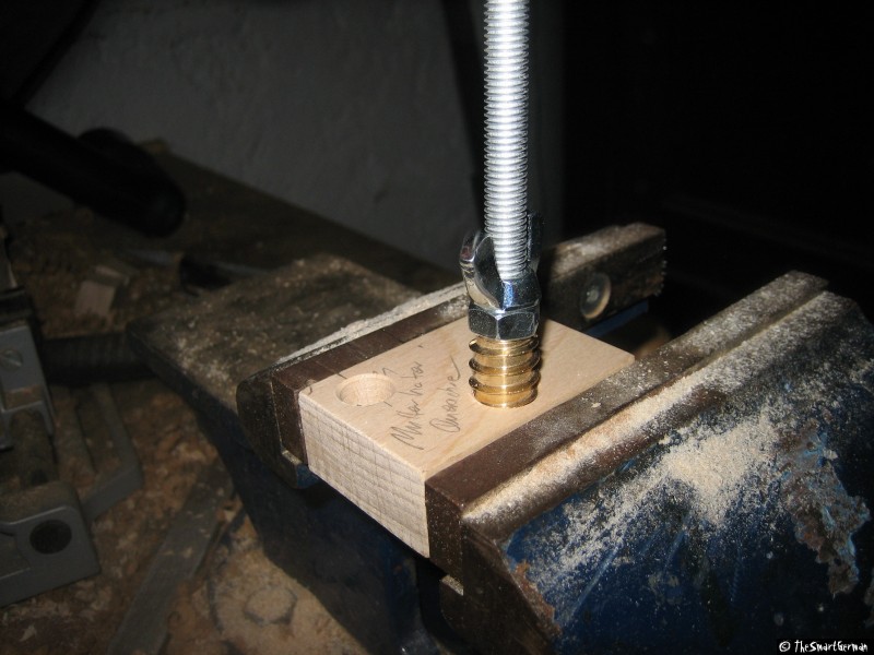 Um den Schlitten zu bewegen muss eine Verbindung zwischen diesem und der Spindel hergestellt werden. Bei einer einfachen Schraubenmutter stellt sich die Frage wie die Verbindung zum Schlitten bewerkstelligt werden kann. In diesem Fall wurde eine Einschraubmutter gewählt. Die Einschraubmutter wird in einen Holzklotz gerade eingeschraubt. Hierfür wurde die Mutter auf eine Gewindestange geschraubt und mit der Standbohrmaschine gerade angesetzt (Die Welle wurde von Hand gedreht). Der Rest wurde mit Hilfe eines Gewindeeisens eingeschraubt.