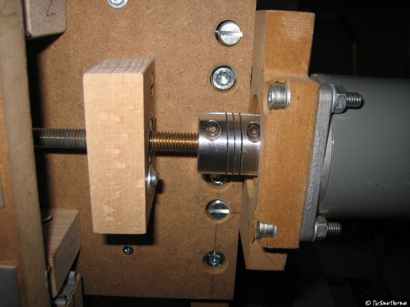 Als Gewindespindeln wurden M8 Gewindestangen auf Messing gewählt. Diese haben im Vergleich zu verzinkten den Vorteil, dass die Oberflächenbeschaffenheit gleichmäßiger ist und somit die Gleiteigenschaften wesentlich besser. Die Gewindespindeln werden jeweils mit Hilfe von selbst sichernden M8 Mutter im einen Lagerblock geklemmt und durch den anderen Lagerblock ohne Klemmung geführt (Technische Mechanik 1 - Ein Festlager, ein Loslager man erinnere sich :P )[3]. Die Verbindung zwischen Schrittmotor und Gewindespindel erfolgt mit Hilfe einer Aluminiumkupplung. Diese ist in der Lage einen leichten Versatz auszugleichen.
