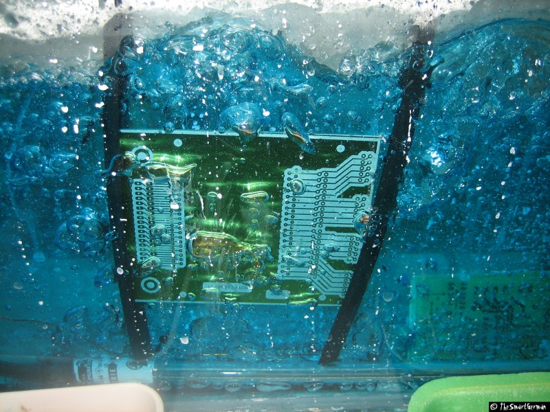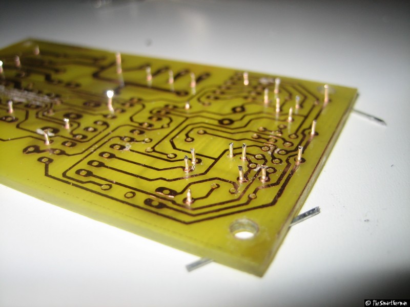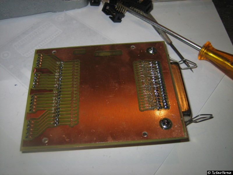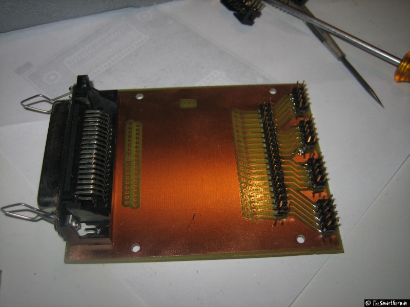 Um die Signale der Centronics Buchse auf die Schrittmotortreiber zu verteilen wurde eine kleine Platine gelayoutet und geätzt. Damit können die Signalleitungen beliebig verbunden werden, hierfür wurde in der Mitte der Platine Platz freigehalten.
