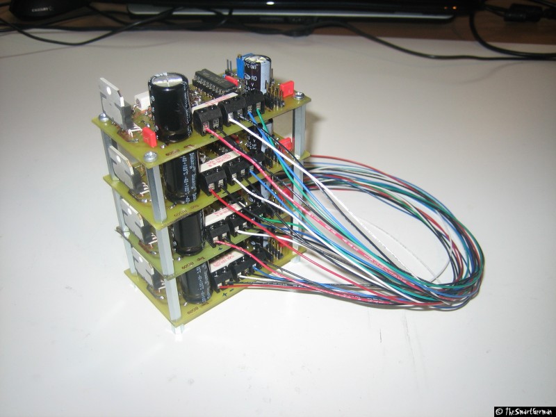 Mit Hilfe der Platine werden die Schrittmotoren mit einfachen Signalen, wie Takt und Richtung angesteuert. Ein Steuer IC (L297) und der Schrittmotortreiber (L298) setzen diese in eine Rotation der Schrittmotoren um. Die Schrittmotortreiber Platine entspricht dem RN-Stepp 297 aus dem Roboternetz[4]. Jedoch wurde die Platine selbst gelayoutet, geätzt und bestückt.