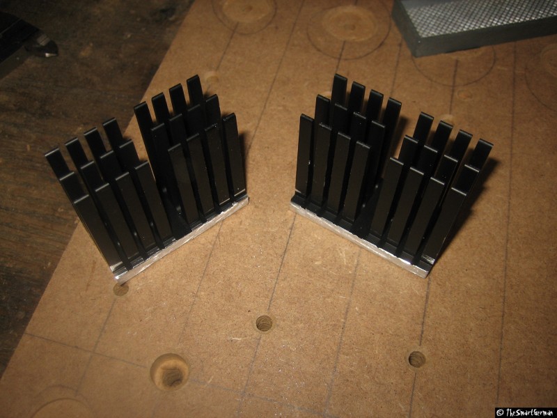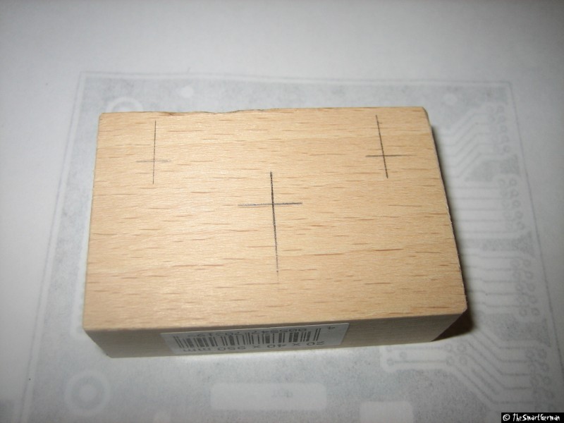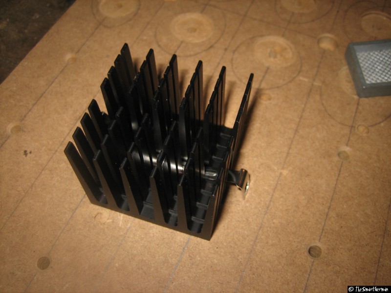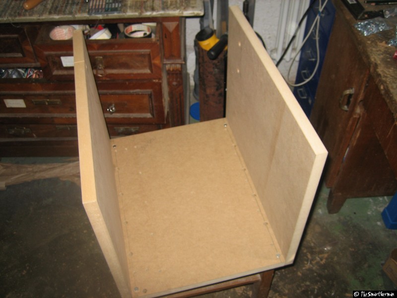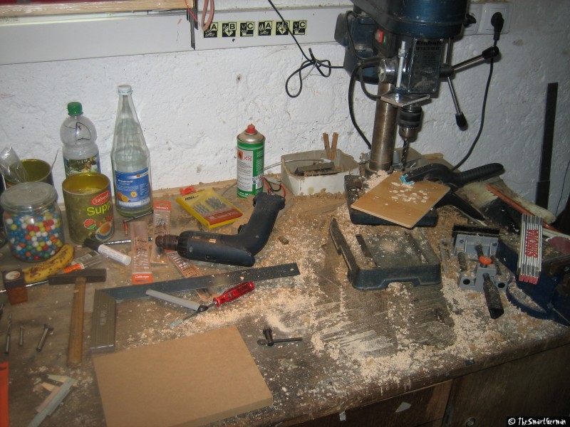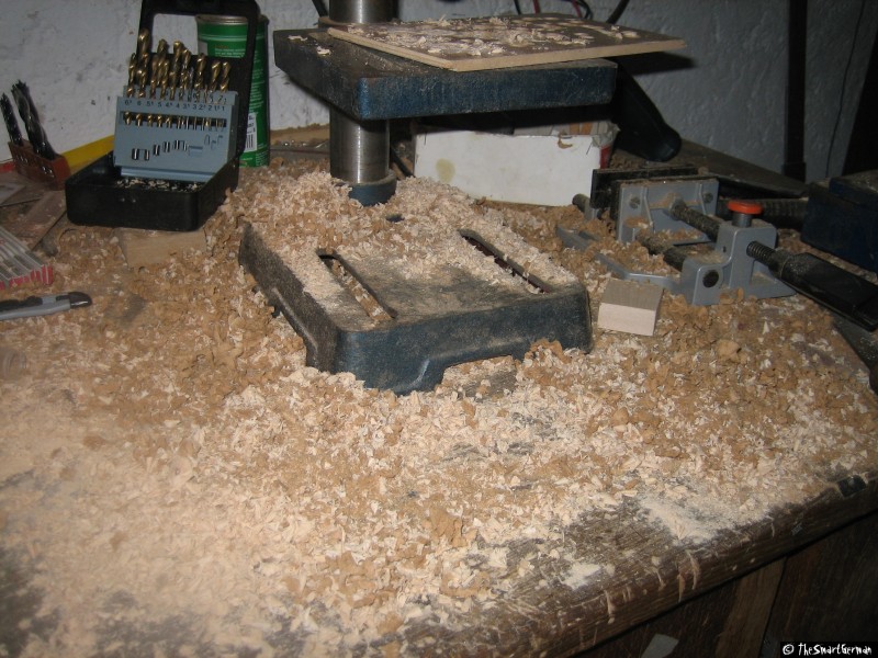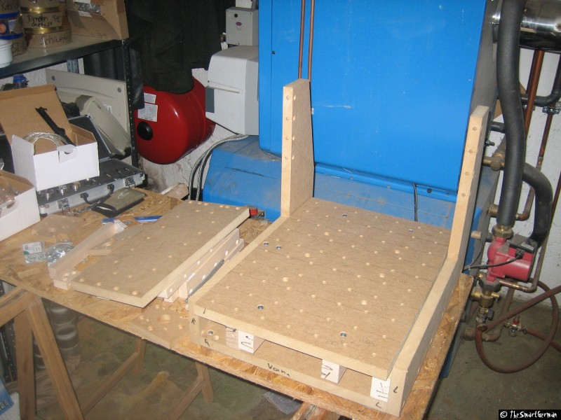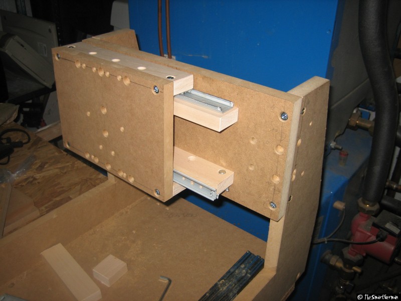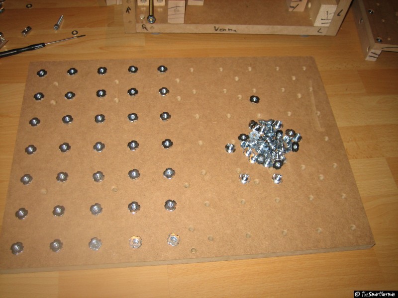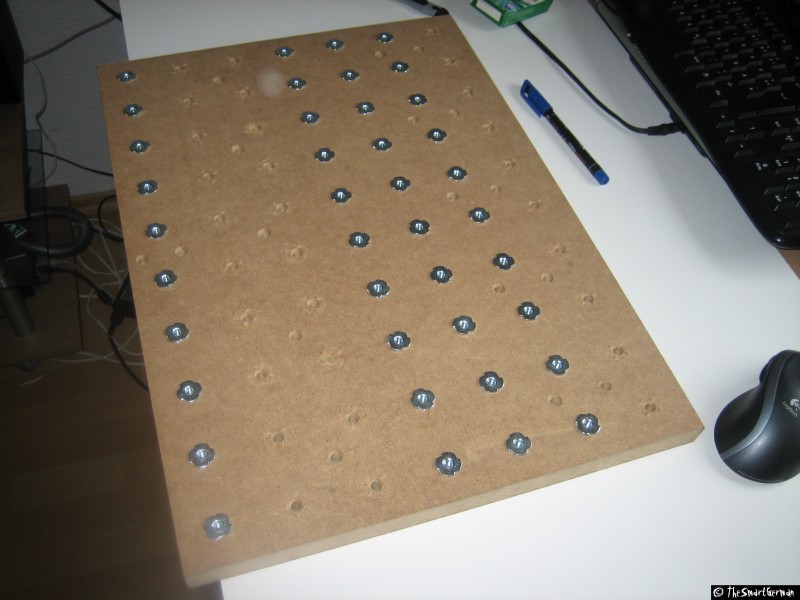 Der Arbeitstisch besteht aus einer 22mm starken MDF Platte. In welche im 5cm Raster Löcher gebohrt wurden. In diese Löcher wurden Einschlaggewindemutter geschlagen. Um nicht mit den Führungen zu kollidieren mussten bei einige Reihen die Löcher gesenkt werden.