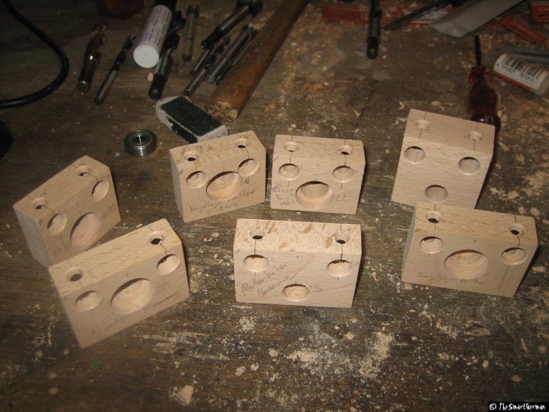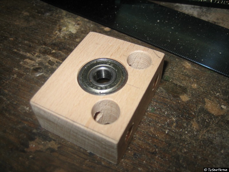Die Kugellagerhalter sind aus Kanthölzern gefertigt.Diese wurden mit Bohrungen versehen: Zum einen die Bohrungen für die Quergewindebolzen und natürlich die Bohrung für das Kugellager. Bei der einseitigen Variante wurde das Loch für das Kugellager direkt mit dem 22mm Forsterbohrer gebohrt. Bei den Haltern mit 2 Kugellagern wurde zuerst mit einem 4mm Bohrer eine Zentrierbohrung gesetzt und danach von beiden Seiten mit 22mm aufgebohrt. Um die Kugellager auf Position zu halten werden diese mit einer kleinen Unterlegscheibe/Holzschaube gesichert.