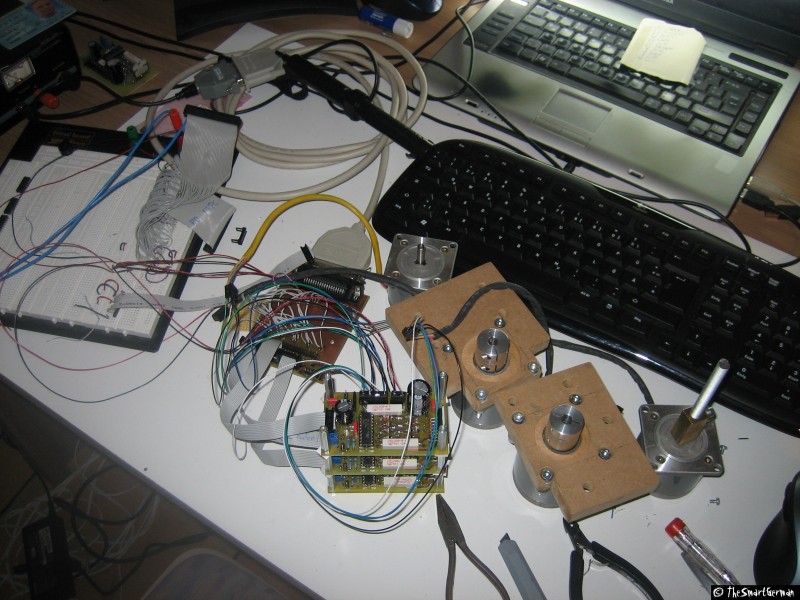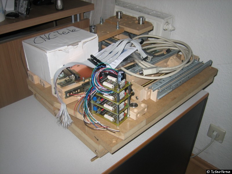 Die Elektronik besteht im wesentlichen aus drei Schrittmotoren Treibern und jeweils 2 Endschaltern für jede Achse. Die gesamte CNC-Maschine wird über die parallele Schnittstelle eines Computers gesteuert. Die Erzeugung der jeweiligen Signale wird dann in Software erledigt.